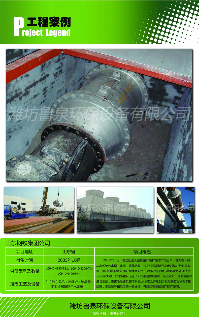 2005年10月,在世界最大型鋼生產(chǎn)線擴能增產(chǎn)項目中,針對循環(huán)冷卻水系統(tǒng)的水垢、腐蝕、菌藻問題,公司領導層研究決定對其進行升級改造,通過對多種水處理方案分析對比,最終決定采用節(jié)能環(huán)保防垢除垢技術-磁化除垢器。此項目投產(chǎn)運行17個月后停產(chǎn)驗收,雙方通過一周時間的跟進與觀察,磁化除垢器及整體系統(tǒng)穩(wěn)定運行,并達到了良好的除垢節(jié)能效果,受到領導和員工的一致好評,并陸續(xù)在集團各廠推廣使用。