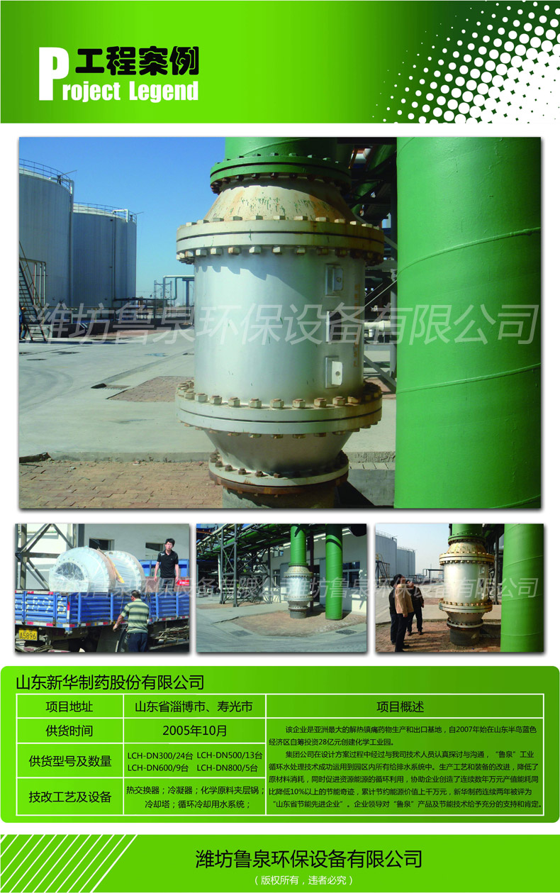 集團(tuán)公司在設(shè)計方案過程中經(jīng)過與我司技術(shù)人員認(rèn)真探討與溝通,“魯泉”工業(yè)循環(huán)水處理技術(shù)成功運用到園區(qū)內(nèi)所有給排水系統(tǒng)中。生產(chǎn)工藝和裝備的 改進(jìn),降低了原材料消耗,同時促進(jìn)資源能源的循環(huán)利用。協(xié)助企業(yè)創(chuàng)造了連續(xù)數(shù)年萬元產(chǎn)值能耗同比降低10%以上的節(jié)能奇跡,累計節(jié)約能源價值上千萬元,新 華制藥連續(xù)兩年被評為“山東省節(jié)能先進(jìn)企業(yè)”。企業(yè)領(lǐng)導(dǎo)對“魯泉”產(chǎn)品及節(jié)能技術(shù)給予充分的支持和肯定。
