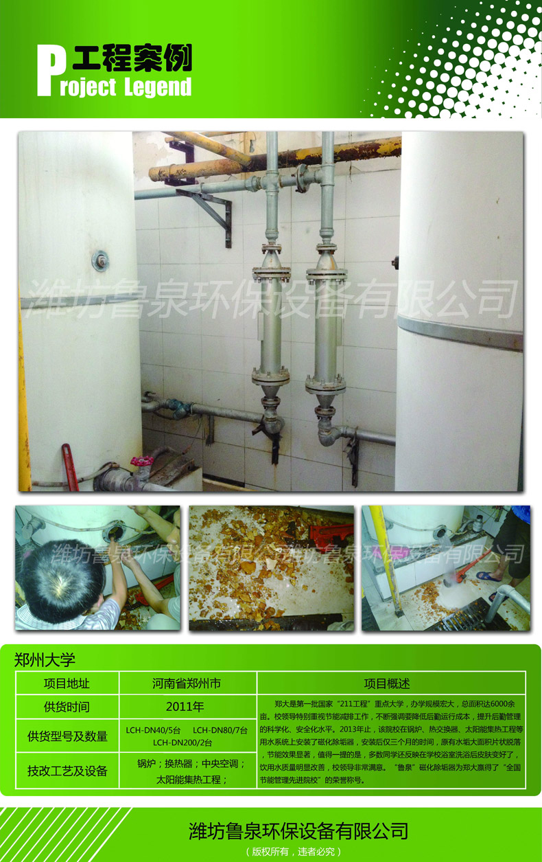 鄭大是批國家“211工程”重點大學(xué),辦學(xué)規(guī)模宏大,總面積達(dá)6000余畝。別榮海副校長特別重視節(jié)能減排工作,不斷強(qiáng)調(diào)要降低后勤運(yùn)行成本,提升后勤管理的科學(xué)化、安全化水平。2012年末,該院校在鍋爐、熱交換器、太陽能集熱工程等用水系統(tǒng)上安裝了磁化除垢器,安裝后僅三個月的時間,原有水垢大面積片狀脫落,節(jié)能效果顯著,值得一提的是,多數(shù)同學(xué)還反映在學(xué)校浴室洗澡后皮膚變好了,飲用水質(zhì)量明顯提高。校領(lǐng)導(dǎo)非常滿意,“魯泉”磁化除垢器為鄭大贏得了“全國節(jié)能管理先進(jìn)院校”的榮譽(yù)稱號。