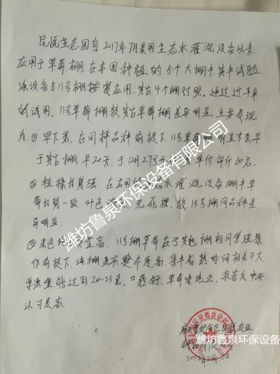 唐山民悅生態(tài)農(nóng)業(yè)科技示范園由曹妃甸區(qū)民悅農(nóng)業(yè)科技有限公司投資建設(shè),園區(qū)坐落于六農(nóng)場曾二村東部,占地面積1200畝,計劃總投資1.2億元。項目目前已完成投資8900萬元,建成各類溫室大棚200座,引進栽植蔬菜、果樹新品種30余個,年產(chǎn)綠色優(yōu)質(zhì)果蔬產(chǎn)品2000余噸。近幾年,為改善果蔬品質(zhì),改良土壤,節(jié)約用水,提高園區(qū)標(biāo)準(zhǔn)管理水平,政府政策指引與濰坊魯泉環(huán)保設(shè)備有限公司達成長期戰(zhàn)略合作協(xié)議。目前科技示范園內(nèi)溫室大棚按照規(guī)化依序安裝魯泉NCH生態(tài)水灌溉設(shè)備。