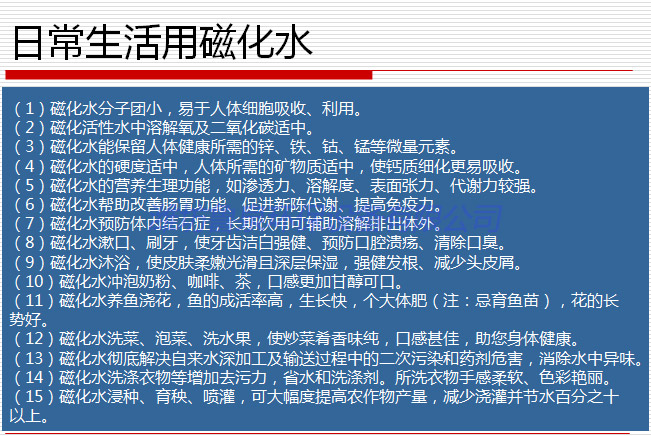 6:磁化水具有充分滅菌功效,抑制細(xì)菌繁殖生長,杜絕細(xì)菌的交叉感染。